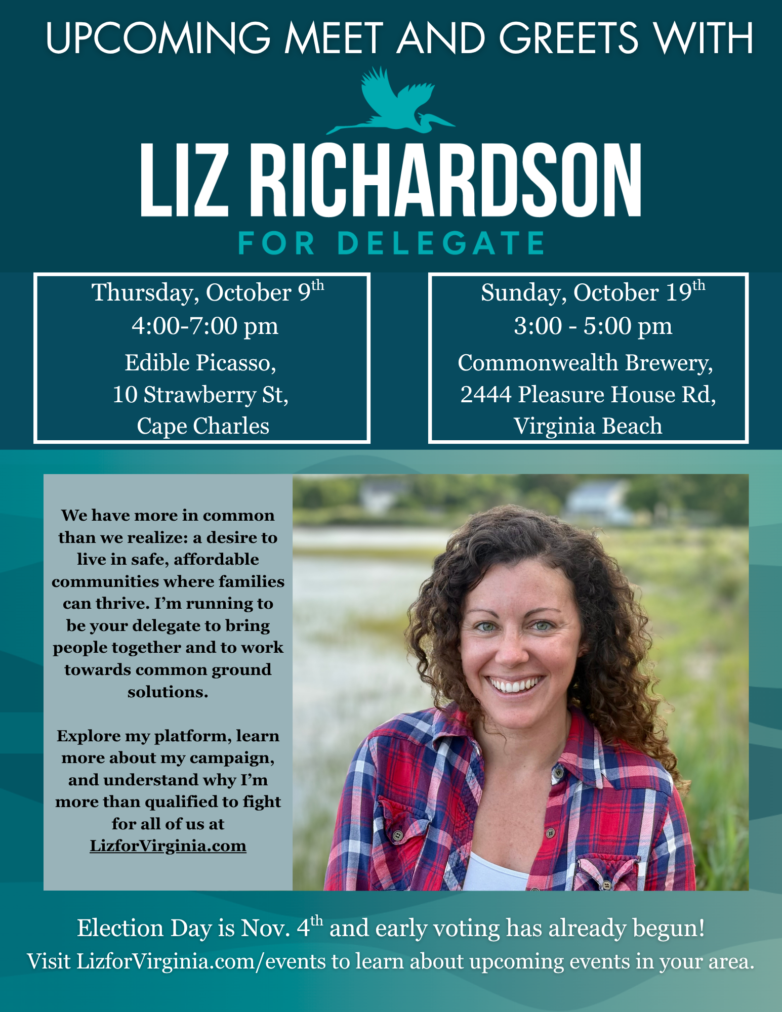 Click here to RSVP to upcoming events October 19th, 3-5pm - Meet & Greet at Commonwealth Brewery! September 30th, 5-7pm - Meet & Greet at Cape Charles Brewing Company! September 23rd, 5:30-7:30pm - Meet & Greet in Greenbackville at the Captain's Cove community room! Refreshments will be served. Please RSVP to david.a.felt@gmail.com